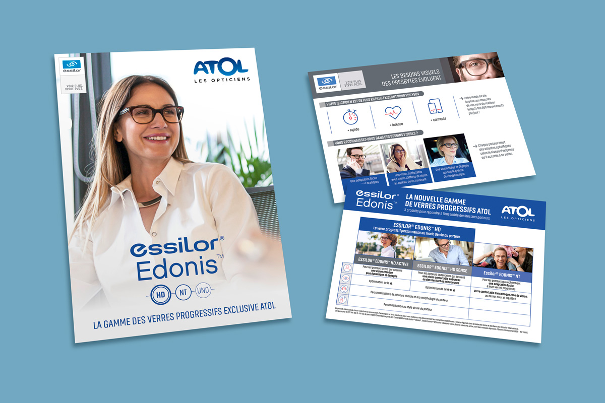 Concevoir le logo et les outils de lancement d’une gamme de verres progressifs exclusive à l’enseigne Atol avec la problématique de mixer le positionnement des 2 marques.